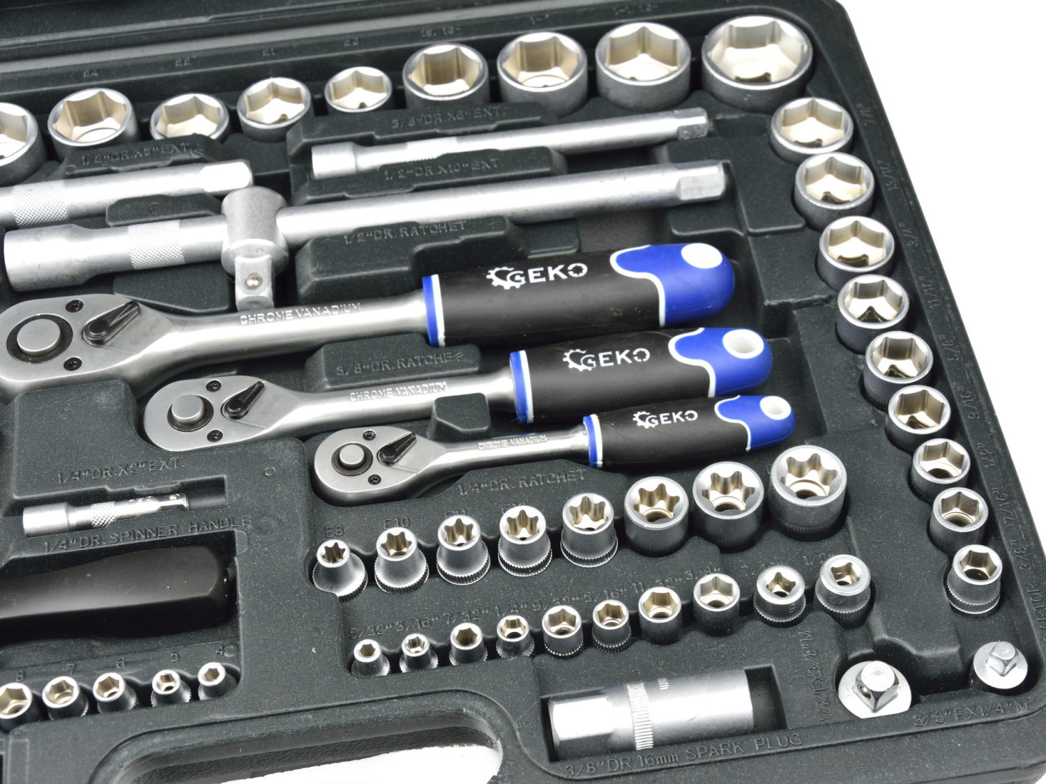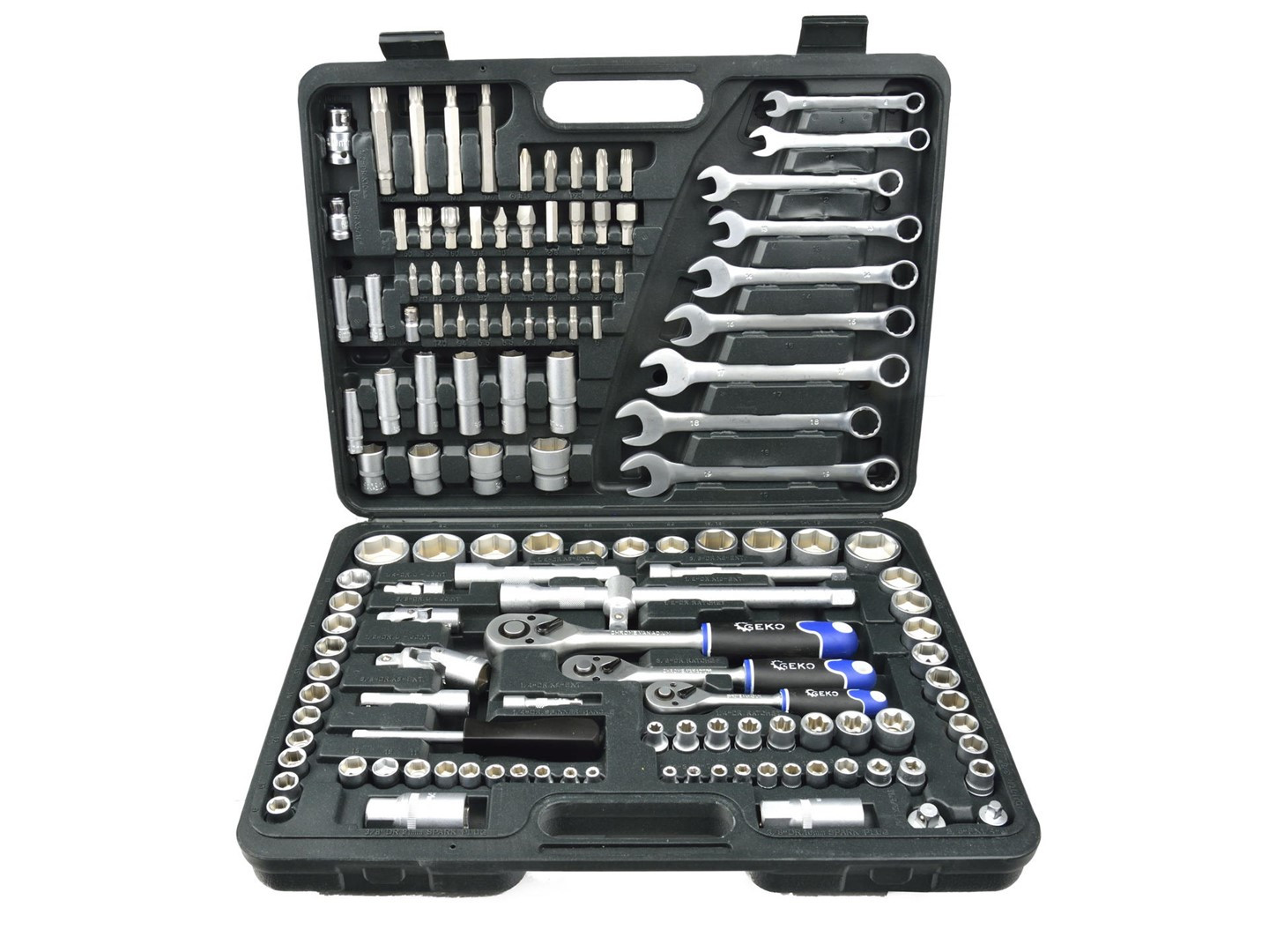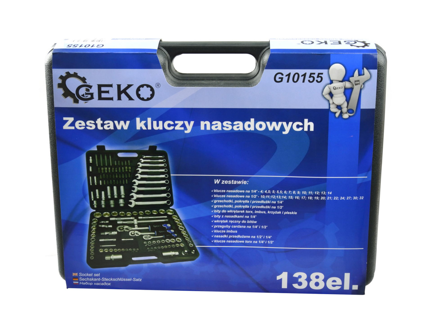 Profesionāla kvalitāte - GEKO mehāniķu rīku komplekts, pulēts CrV, 138 gab. 1/4", 3/8" un 1/2" piedziņai.